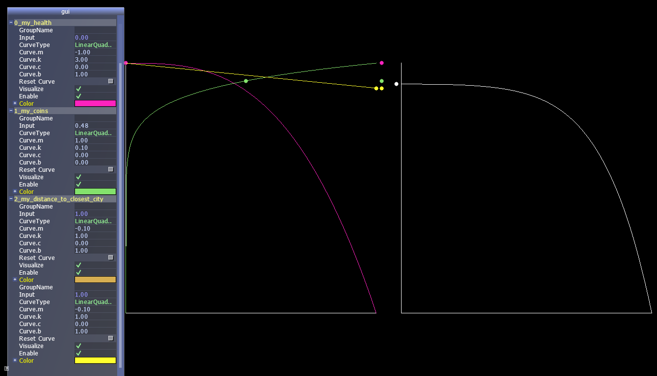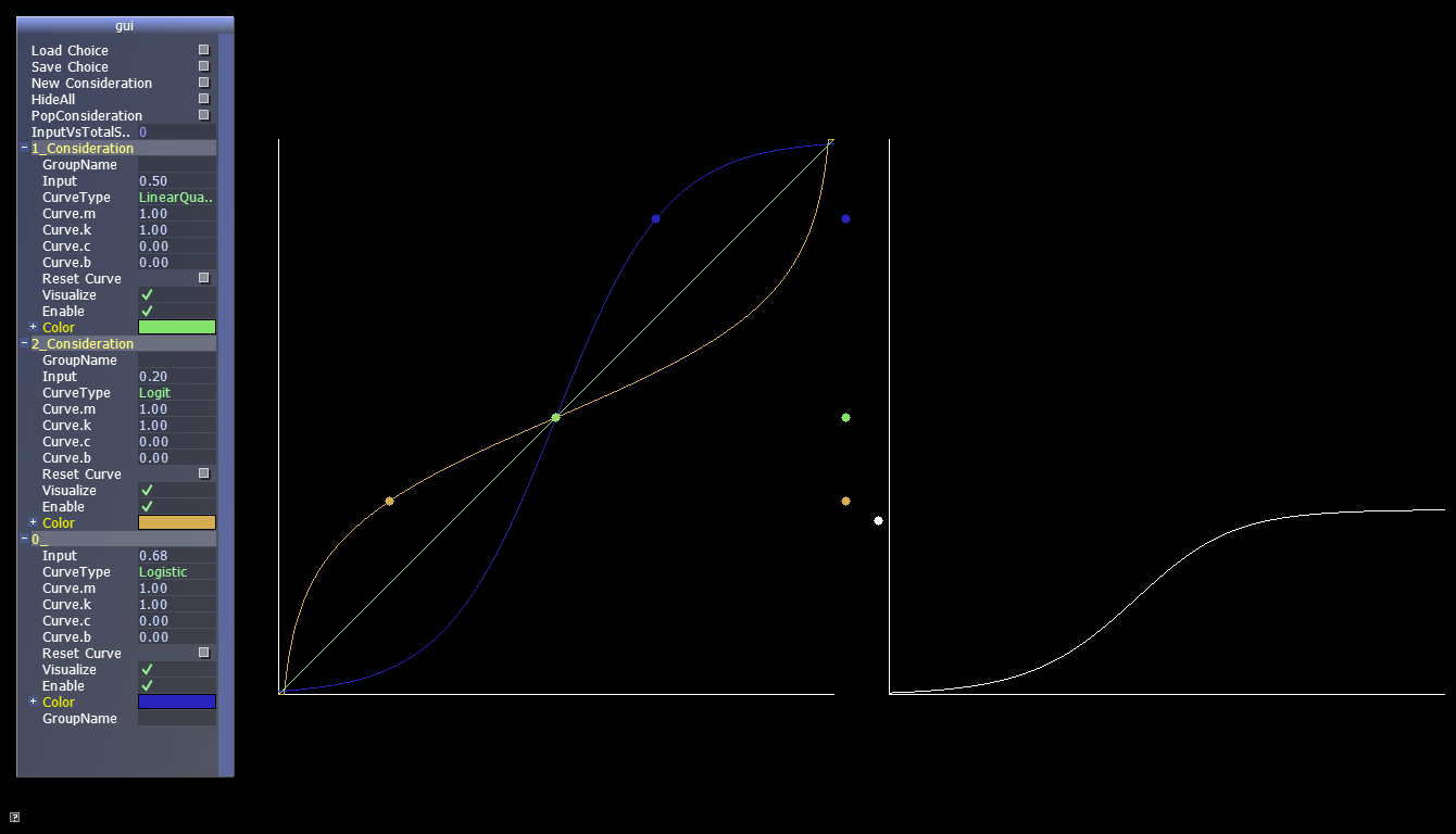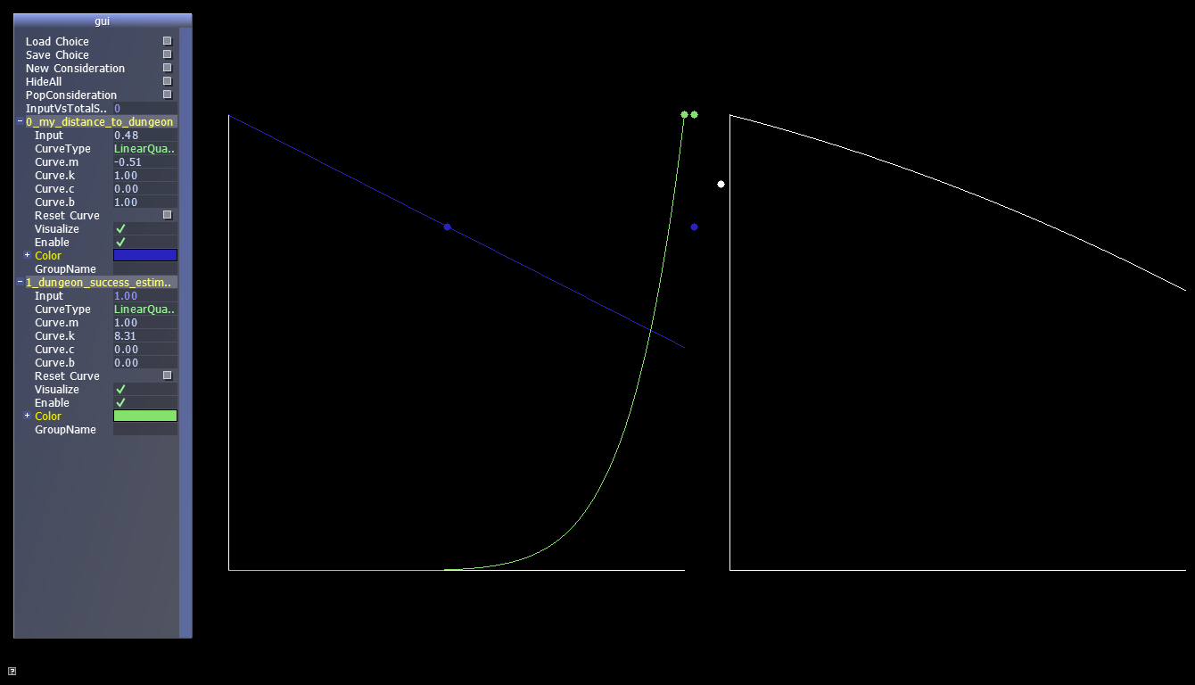Originally I was hoping that by this week I'd have an example using utility AI. Well, I miscalculated how much time things take. On the plus side, I developed a tool that is going to help with setting up the curves properly and visualize how considerations are combined together. The tool has a GUI (using AntTweakBar) that allows adding/removing considerations, adjusting curves, setting up mock inputs, calculating scores and saving/loading to a file (as a list of lines in the form "consideration_name normalized_input curve_type curve_coeffs"). Here's how it looks like: