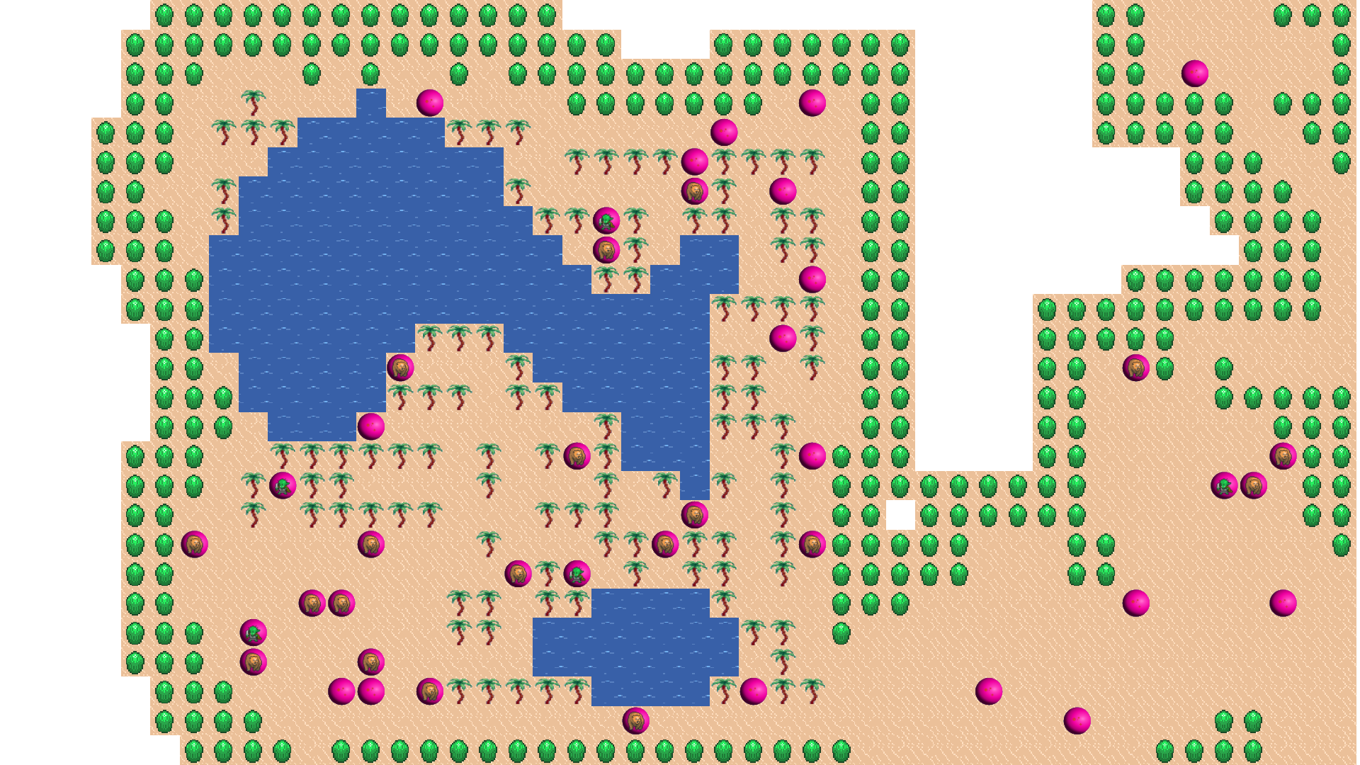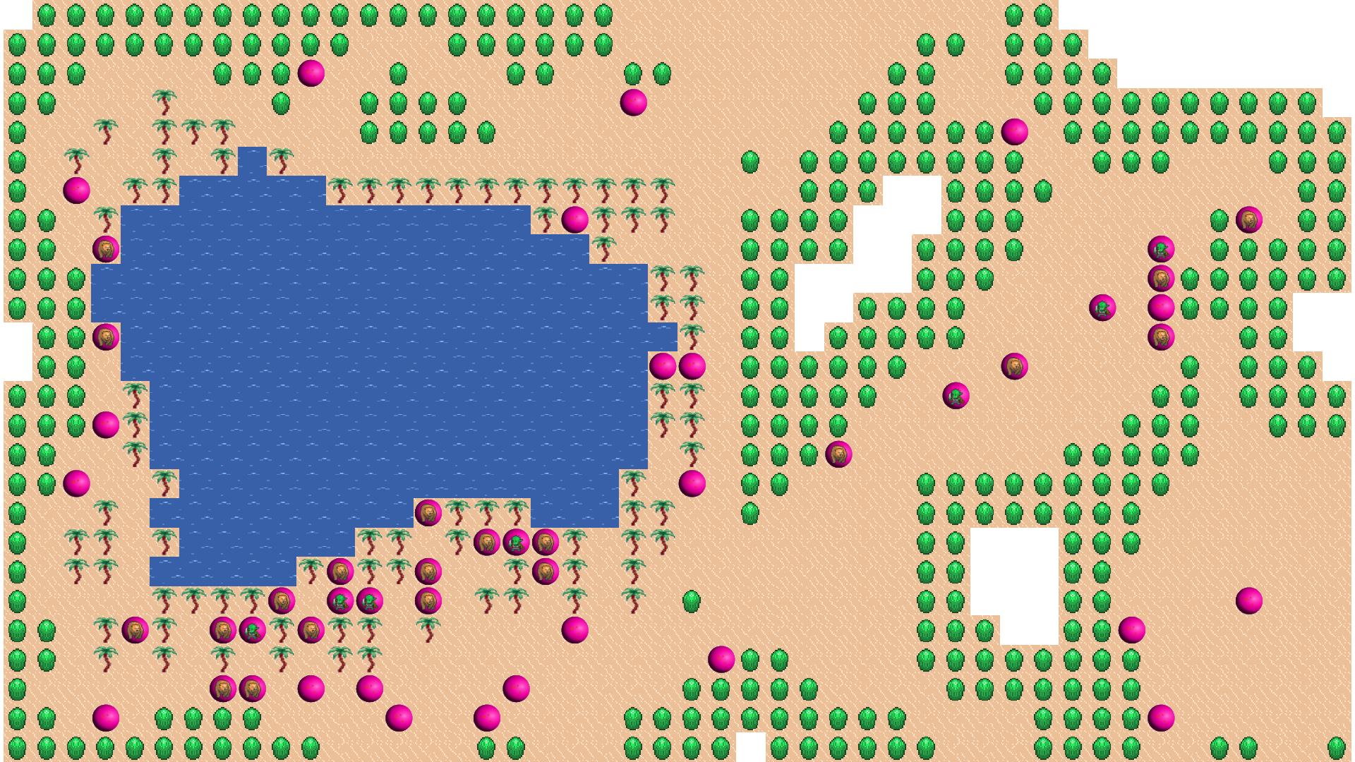 - Oasis. This is an outdoors area that contains a big body of water, it's surrounded by trees (but still allowing access to the water) and lots of wildlife are around as well, and other "decoration" which might map to desert-themed flowers/grass etc.